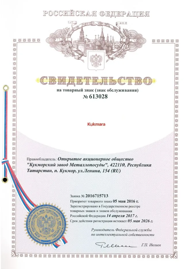 Поговорим о литой алюминиевой посуде, которую Kukmara производит с 1950 года. Отличительным знаком оригинальной продукции Kukmara является товарный знак в виде логотипа Kukmara (свидетельство на товарный знак № 613028 от 5 мая 2016г.), который присутствует на дне практически каждого изделия.