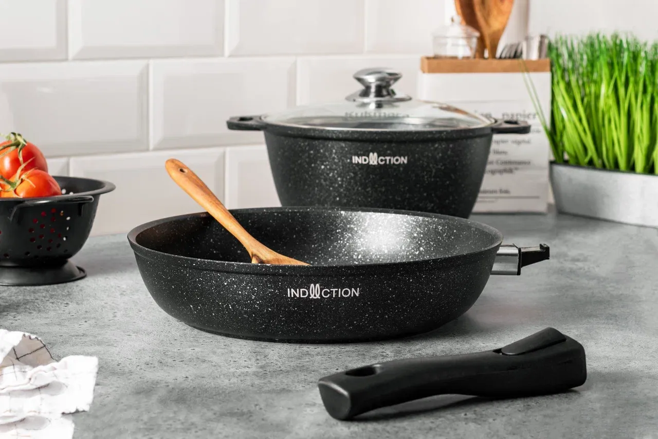 Индивидуальные коробки и обечайки посуды с антипригарным покрытием универсальны как для посуды с индукционным дном, так и без.